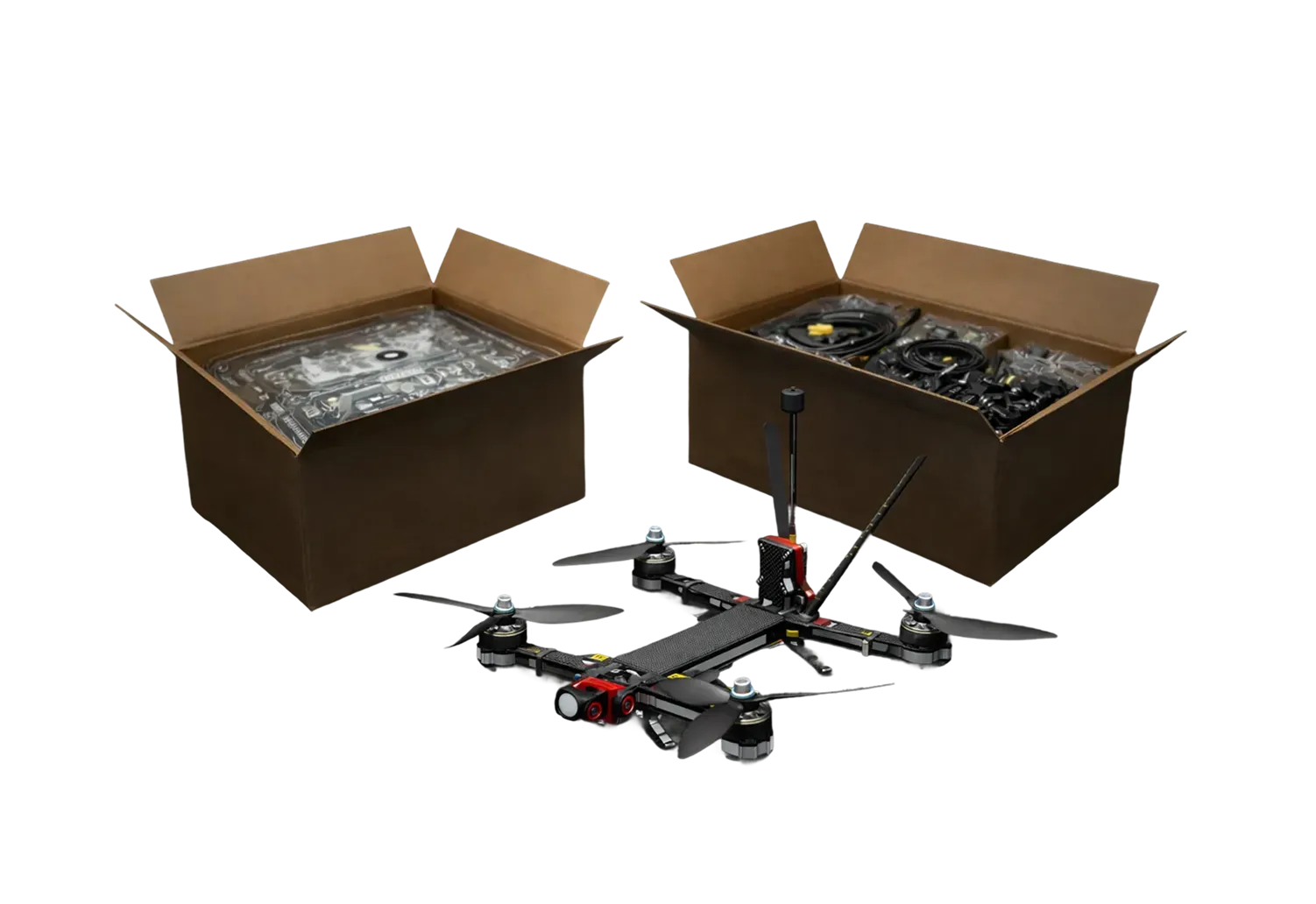 Made-in-US 8” or 13” FPV drone, fully assembled to customer specifications and ready to fly once the end user installs the battery and payload.